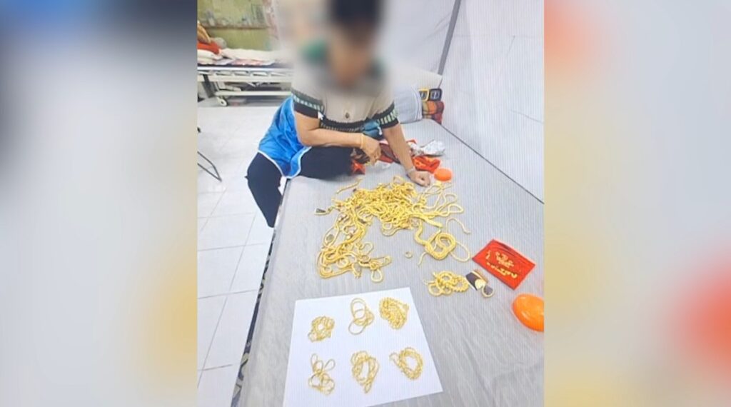 กล้องวงจรปิดบันทึกภาพแม่บ้านร้านทองแห่งหนึ่ง อ.บ้านไผ่ จ.ขอนแก่น ขณะกำลังบรรจงจัดเรียงสร้อยทองใส่ตู้ทีละเส้น ก่อนหยิบสร้อยใส่กระเป๋ากางเกงของตัวเอง เจ้าของร้านทอง เปิดเผยว่า พบความผิดปกติครั้งแรกเมื่อวันที่ 9 ก.ย. 67 แม่บ้านทำทองรูปพรรณหล่นจากเสื้อกันเปื้อน บริเวณห้องครัวหลังร้าน ตนร้านถามว่าเอาทองมาจากไหน แม่บ้านคนดังกล่าวอ้างว่าน่าจะหล่นจากตู้โชว์มาใส่ผ้ากันเปื้อนของตน