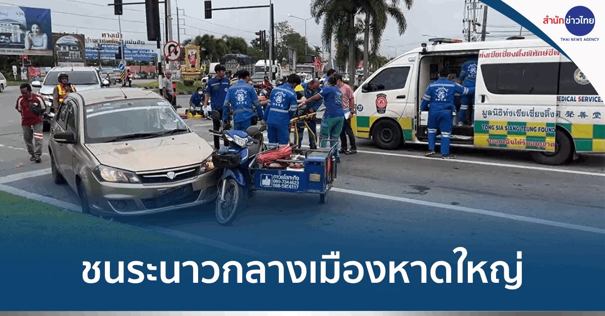 เกิดอุบัติเหตุรถชนกันหลายคัน กลางสี่แยกเลี่ยงเมืองหาดใหญ่ จังหวัดสงขลา ซึ่้งเป็นสี่แยกใหญ่เส้นทางเลี่ยงเมืองและเข้าออกตัวเมืองหาดใหญ่ เจ้าหน้าที่ตำรวจและหน่วยกู้ชีพหลายแห่ง ร่วมกันลงพื้นที่ตรวจสอบ และช่วยเหลือผู้บาดเจ็บ พบรถเก๋งทะเบียนมาเลเซีย ถูกชนเข้ากลางตัวรถด้านซ้ายจนยุบ กระจกหน้าแตก คนในรถสองคนบาดเจ็บ อีกคันเป็นรถยนต์ทะเบียนสงขลา ด้านหน้าพัง นอกจากนี้ มีรถจักรยานยนต์อีก 2 คัน และรถจักรยานยนต์พ่วงข้างอีก 1 คัน ที่ถูกแรงกระแทกจากรถยนต์สองคัน