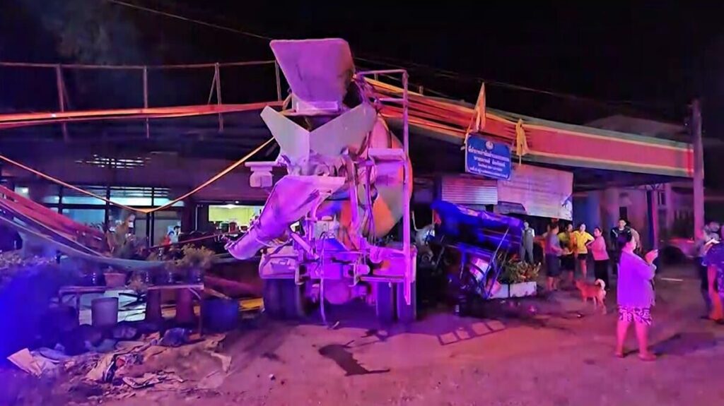 สระบุรี 13 พ.ย. – ระทึก! คนขับรถโม่ปูนวูบ ฝ่าไฟแดง ชนเก๋งกลางแยก ก่อนพุ่งเข้าร้านค้าพังยับ