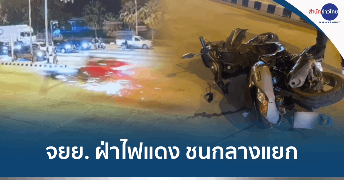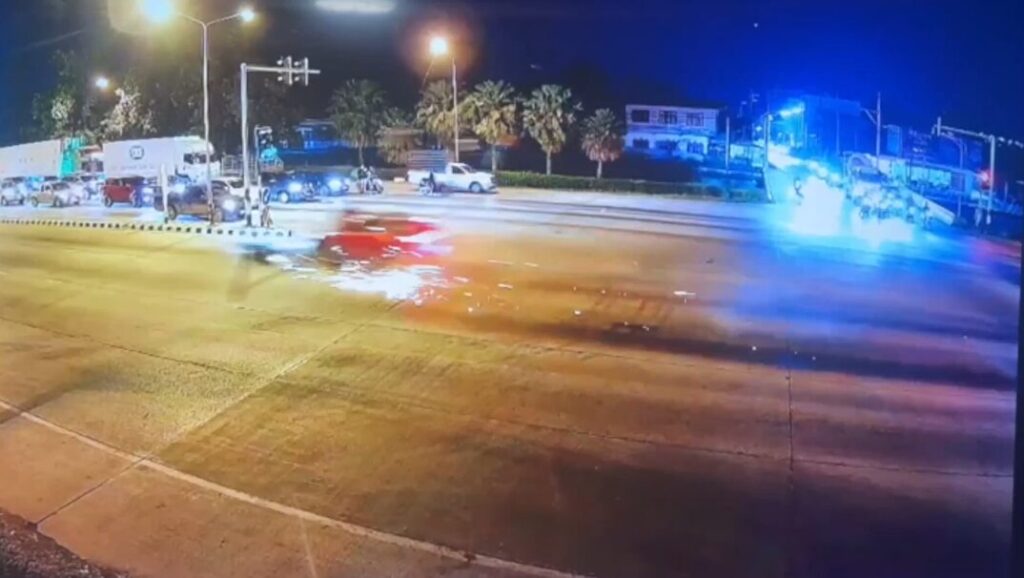 วงจรปิดบริเวณสี่แยกบันทึกภาพ รถจักรยานยนต์ฝ่าสัญญาณไฟแดง ไปตัดหน้ารถเก๋งที่มาด้วยเร็ว จึงถูกพุ่งชนอย่างจังตรงกลางสี่แยกพอดี