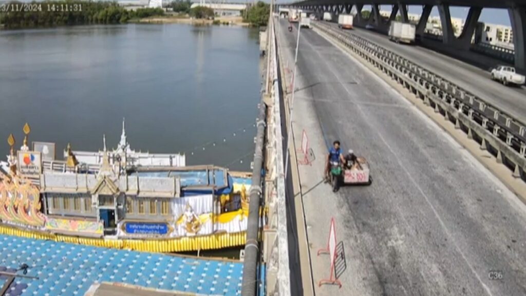 กล้องวงจรปิดระบุวันที่ 13 พฤศจิกายน เวลา 14.00 น. บันทึกภาพชาย 2 คน ขี่รถซาเล้งบนสะพานข้ามแม่น้ำ บริเวณสี่แยกซินเอี่ยว ถนนสายโรงไฟฟ้าบางปะกง ต.ท่าข้าม อ.บางปะกง จ. ฉะเชิงเทรา บนสะพานจะเห็นว่ารถขี่ผ่านหน้ากล้องแล้ววนกลับมาอีกรอบ แต่หากดูภาพจากกล้องด้านข้างสะพานจะเห็นชายเสื้อดำลงมาตัดสายไฟ ซึ่งอยู่ระหว่างการติดตั้งสัญณาณไฟจราจร ก่อนจะหลบหนีไป