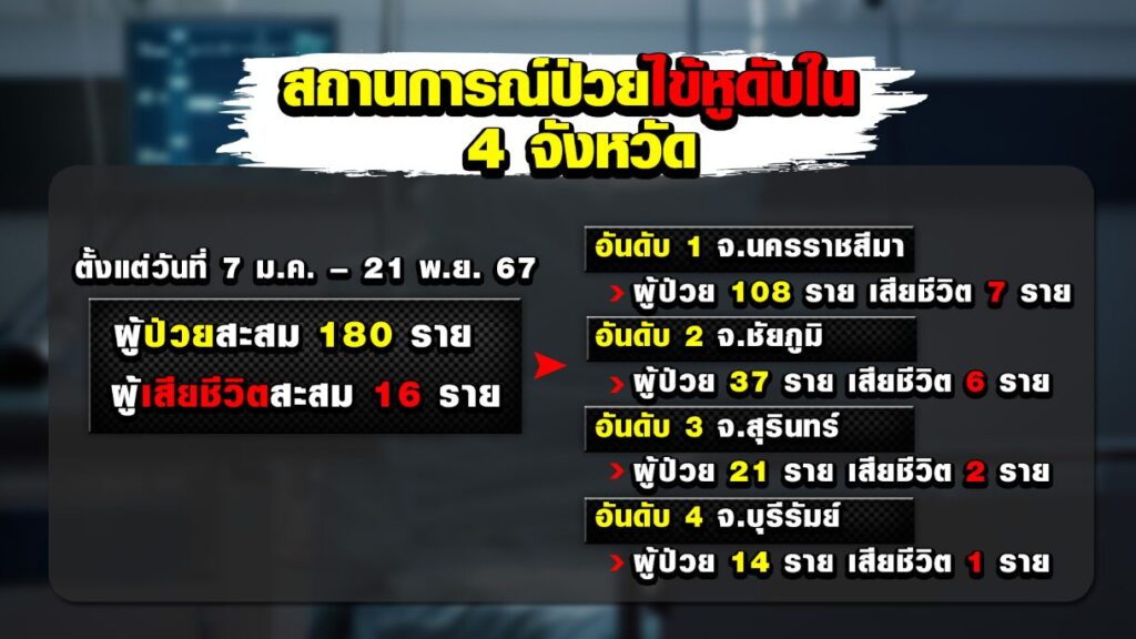 สถานการณ์ตั้งแต่วันที่ 7 มกราคม ถึง 21 พฤศจิกายน 2567 พบผู้ป่วยโรคไข้หูดับ 180 ราย มีผู้เสียชีวิตสะสม 16 ราย แยกเป็น