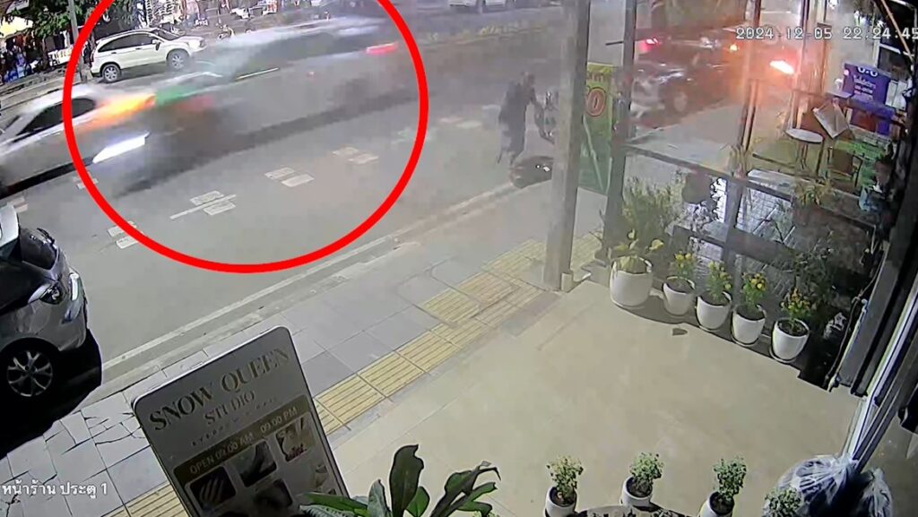 ภาพวงจรปิดเมื่อเวลา 21.00 น. วันที่ 5 ธ.ค.ที่ผ่านมา รถตู้สีขาวขับมาด้วยความเร็วพุ่งชนท้ายรถเก๋งสีดำจนพลิกคว่ำ กระเด็นไปทับรถอีกคันที่จอดอยู่ข้างทาง และรถจักรยานยนต์อีกหลายคันที่จอดเรียงกันจนเสียหาย ชาวต่างชาติที่ยืนอยู่ตรงทางเท้าถึงกับกระโดดหนีเพื่อความปลอดภัย เหตุเกิดบนถนนเทพประสิทธิ์ ต.หนองปรือ อ.บางละมุง จ.ชลบุรี