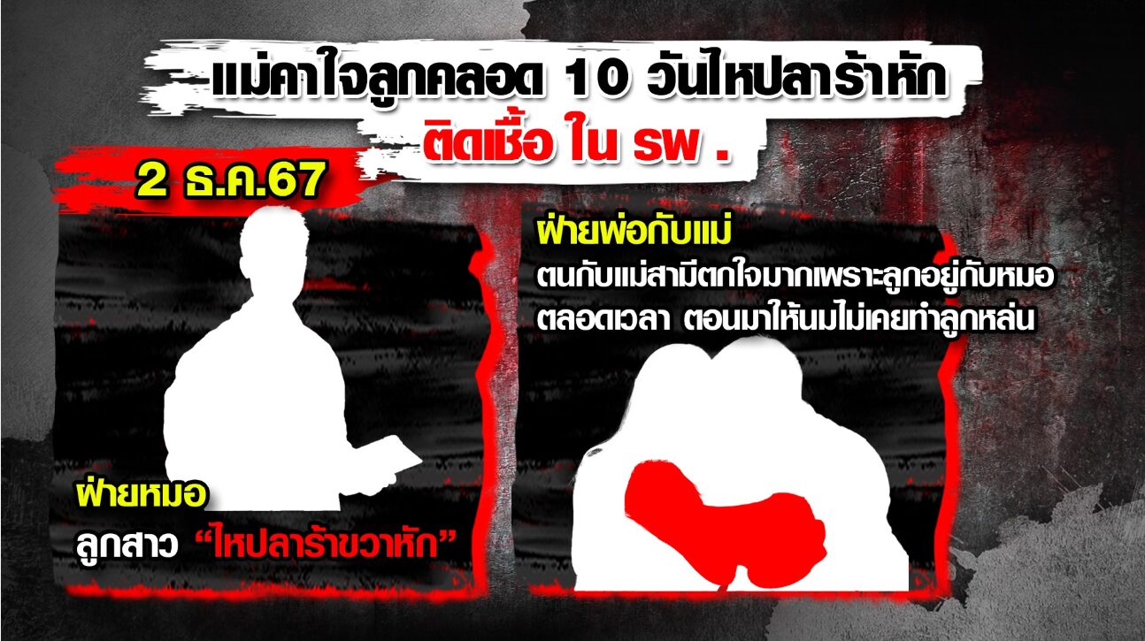 ต่อมาเมื่อวันที่ 2 ธันวาคม หมอแจ้งว่าลูกไหปลาร้าขวาหัก ตนกับแม่สามีตกใจมาก เพราะลูกอยู่กับหมอตลอดเวลา ตอนมาให้นมไม่เคยทำลูกหล่น หรือถ้าทำหล่น ตนต้องแจ้งหมอแน่นอน แต่หมอก็ไม่อธิบายสาเหตุที่ไหปลาร้าหัก แต่กลับบอกเพียงว่ากระดูกจะต่อเองได้ จากนั้นถัดมาคือวันที่ 3 ธันวาคม ช่วงบ่าย หมอก็แจ้งอีกว่า ลูกสาวติดเชื้อขั้นรุนแรง ถ่ายเป็นเลือด ยิ่งสร้างความมึนงงให้ครอบครัวเป็นอย่างมาก เพราะลูกออกมามีสุขภาพแข็งแรง น้ำหนักมาตรฐาน เพียงแค่ตัวเหลืองเท่านั้น รู้สึกติดใจอาการของลูก