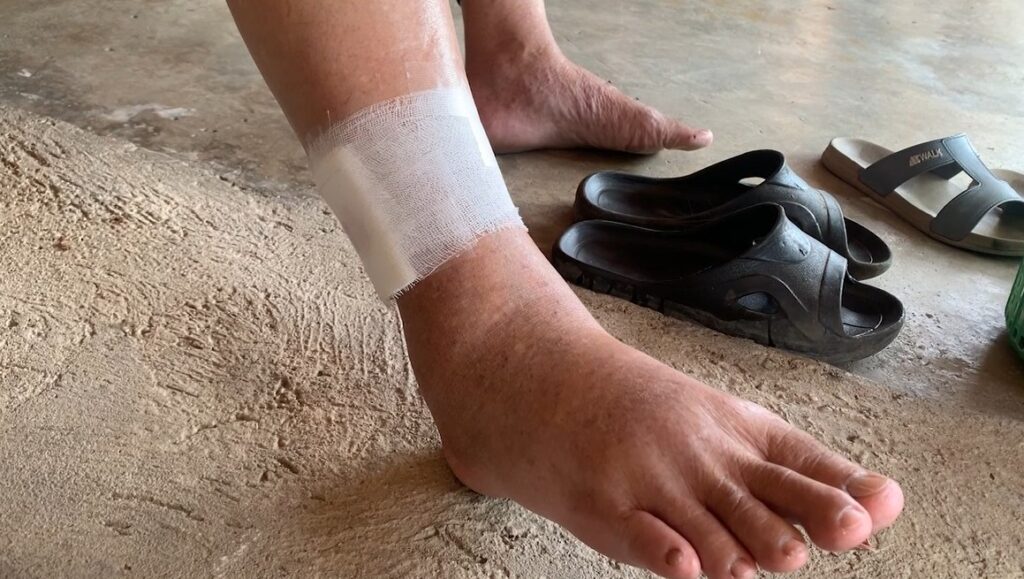 นอกจากนี้ นายต่อง อายุ 79 ปี เป็นอีกหนึ่งในผู้บาดเจ็บ อยู่หมู่บ้านเดียวกันกับนายสรธัญ ได้รับบาดเจ็บที่บริเวณขาขวา เย็บ 5 เข็ม เล่าว่า เมื่อวานนี้ขี่รถบนถนนในหมู่บ้านอยู่ดีๆ มีก้อนหินกระเด็นมาโดนขา เข้าใจว่าหินกระเด็นใส่เอง ตนจึงจอดรถแล้วเก็บขึ้นมา จนมีชาวบ้านที่อยู่ตรงจุดเกิดเหตุบอกว่ามีคนปาก้อนหินใส่ตน