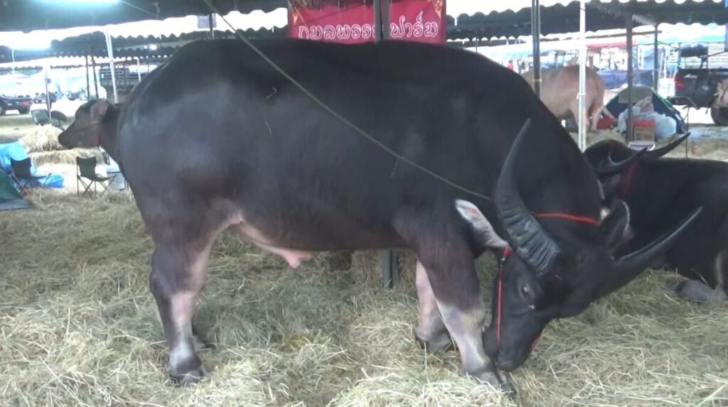 นอกจากนี้ ยังมีควาย จากกมลพรรณฟาร์ม อำเภอแม่แตง จังหวัดเชียงใหม่ ของคุณ กมลพรรณ ตานุ ที่เลี้ยงควายสวยงาม ขายน้ำเชื้อ ควายเพศผู้ ชื่อใบบุญ อายุ 4 ปี 4 เดือน น้ำ หนัก 1,400 กิโลกรัม สูง 173 เซนติเมตร ที่นำมาโชว์ด้วย โดยเจ้าใบบุญเป็นพ่อพันธุ์น้ำดี ระดับแกรนด์แชมป์เปี้ยน ภาคเหนือ ปี 2566 ที่จังหวัดแพร่ ขายน้ำเชื้อ 1 หลอด ราคา 500 บาท หรือ 12 หลอด 5,000 บาท และยังมีควายแคระ หรือควายเตี้ยเผือก ชื่อน้องข้าวเหมย เป็นการผสมระหว่าง แม่พันธุ์ชื่อ ทองกวาว อายุ 4 ปี และพ่อพันธุ์ชื่อข้าวเหนียว ได้ลูกเป็นควายเผือกแคระ ตั้งชื่อน้องข้าวเหมย อายุ 3 เดือน กำลังซุกซนแต่ก็เชื่อง ทำให้เป็นที่สนใจของประชาชน ที่มาเที่ยวชม พากันมาถ่ายภาพ.-สำนักข่าวไทย