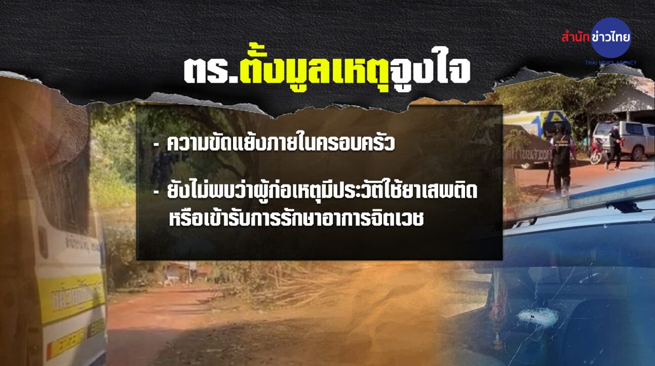 สอบสวนภรรยา นายประกอบ ผู้บาดเจ็บ ทราบว่าผู้ก่อเหตุ เป็นหลานชายนายประกอบ และบ้านอยู่ใกล้กัน โดยก่อนเกิดเหตุ ผู้ก่อเหตุได้มาหานายประกอบที่บ้าน ก่อนมีปากเสียงทะเลาะกัน จากนั้นผู้ก่อเหตุใช้อาวุธปืนพกสั้นลูกโม่ ขนาด .38 ยิงนายประกอบ และลูกชาย บาดเจ็บ แต่ขณะเดินออกจากบ้าน ก็ยังก่อเหตุยิงชาวบ้านซึ่งเป็นผู้หญิง 1 คน กำลังเดินผ่านมาหน้าบ้านนายประกอบ เสียชีวิต ระหว่างนั้นมีชาวบ้านชาย 1 คน ขี่จักรยานยนต์มา และพยายามเข้าไปช่วยผู้หญิงที่ถูกยิง ก็ถูกผู้ก่อเหตุยิงเสียชีวิตเป็นคนที่ 2 จากนั้นผู้ก่อเหตุ ได้วิ่งหลบเข้าไปในบริเวณบ้านเขา ก่อนยิงตัวเองเสียชีวิต