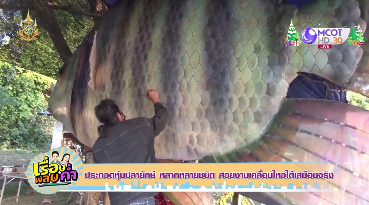 หุ่นปลายักษ์ ขนาดความสูงกว่า 3 เมตร ยาวกว่า 3-5 เมตร เกิดจากภูมิปัญญาชาวบ้าน ในพื้นที่ อ.ศรีสงคราม จ.นครพนม ตั้งใจถอดแบบจากปลาลุ่มน้ำโขง ปลาลุ่มน้ำสงคราม อาทิ ปลาบึก ปลาตองกาย ปลานาง ปลาอไท ปลาค้าว ปลาปาก ปลากด มาสร้างเป็นหุ่นปลายักษ์ ทำจากโครงเหล็ก ประดับตกแต่งด้วยกระดาษแข็ง และวัสดุทั่วไป สามารถเคลื่อนไหวได้ โชว์การแหวกว่าย บนขบวนรถแห่ของชาวบ้านชุมชนต่างๆ มากกว่า 10 ขบวน นอกจากสื่อถึงความคิดสร้างสรรค์ ยังแสดงออกถึงความภาคภูมิใจของชาวบ้านอาชีพประมงในลุ่มน้ำสงคราม เนื่องจากเป็นพื้นที่อำเภอสำคัญ ติดกับลำน้ำสาขาสายหลักของแม่น้ำโขง คือ ลำน้ำอูน ลำน้ำสงคราม ทั้งยังเป็นแหล่งเพาะขยายพันธุ์ปลาที่สำคัญของแม่น้ำโขง ทุกปีจะเกิดปัญหาน้ำโขงหนุนเอ่อท่วมพื้นที่การเกษตร และพื้นที่ลุ่มน้ำ จึงมีปลาขึ้นมาขยายพันธุ์ วางไข่ในป่าบุ่งป่าทาม ช่วงฤดูฝนไม่สามารถทำการเกษตรได้ ชาวบ้านส่วนใหญ่จึงหันไปทำอาชีพประมง หาปลาขาย และมีการแปรรูปปลาส่งขายตลาด สร้างรายได้ และทำการเกษตรในช่วงฤดูแล้งแทน