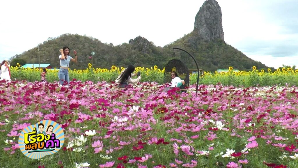 สำหรับทุ่งดอกไม้ผสมที่เจ้าของปลูกเอาไว้นั้นมีดอกคอสมอสสีขาว สีแดง สีชมพู อยู่แปลงหน้าตัดกับดอกทานตะวันที่ผลิบานเหลืองอร่ามด้านหลัง ภายในไร่ยังมีจุดให้นักท่องเที่ยวถ่ายรูปทุกมุมในแปลงดอกไม้กว่า 50 ไร่