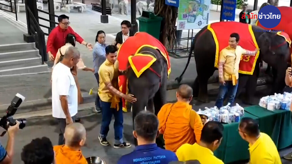 ช้างสวนนงนุช 9 เชือกตักบาตรพระสงฆ์