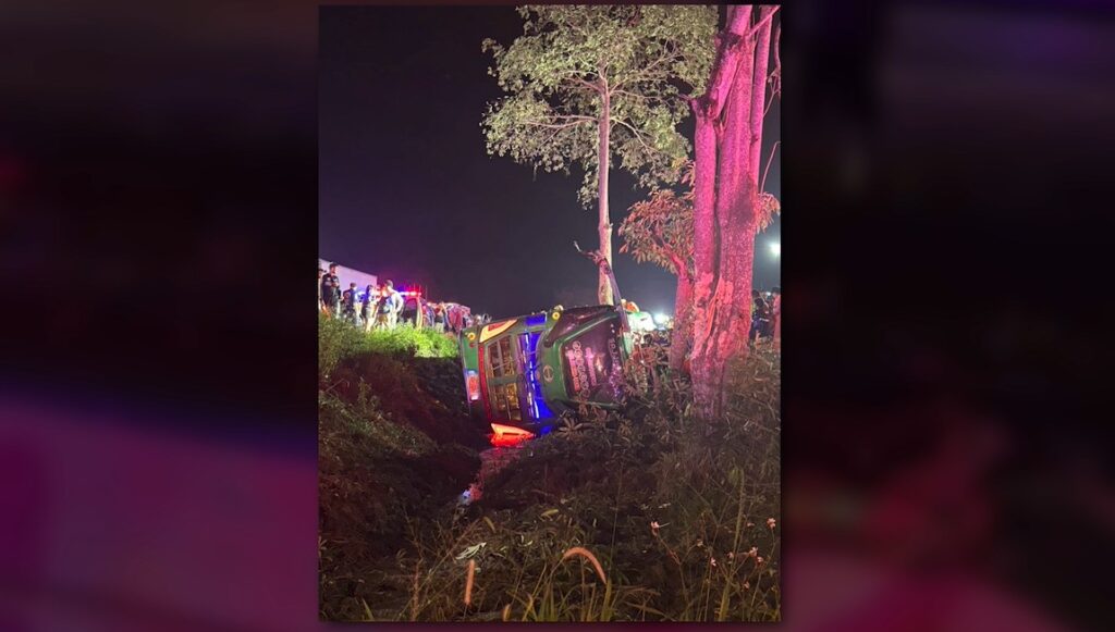 สุราษฎร์ธานี 2 ม.ค. – รถทัวร์พาผู้โดยสารกลับจากเที่ยว อ.เบตง จ.ยะลา เสียหลักไถลลงร่องกลางถนนชนต้นไม้บนถนนสาย 41 อ.ไชยา จ.สุราษฎร์ธานี เบื้องต้นเสียชีวิต 8 ราย บาดเจ็บจำนวนมาก