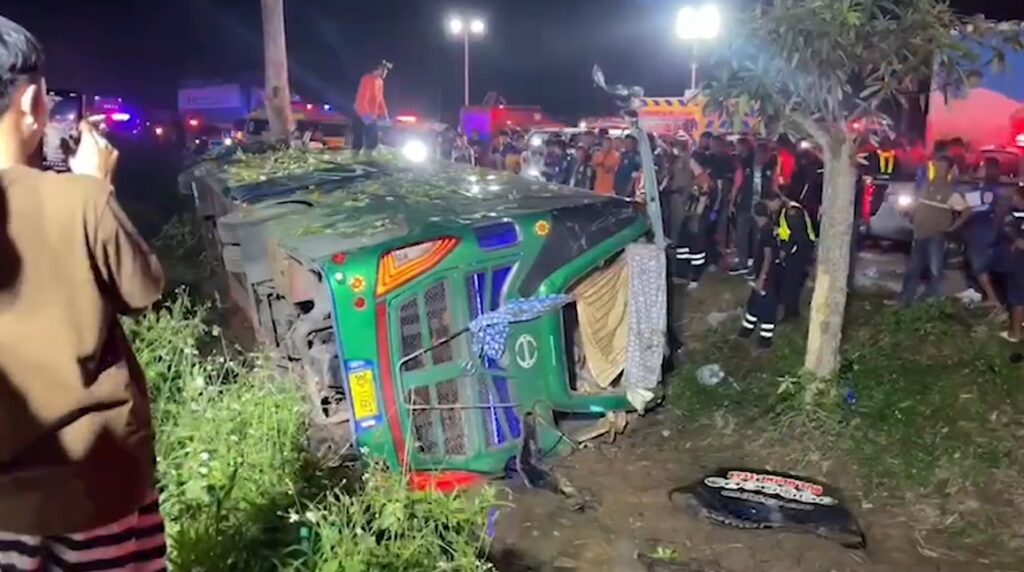เหตุการณ์นี้เกิดขึ้นช่วงหัวค่ำวานนี้ (1 ม.ค.) บนถนนสายเอเชีย 41 ใกล้แยกป่าเว (ขาขึ้น) ต.ป่าเว อ.ไชยา จ.สุราษฎร์ธานี ห่างจากจุดรถกระบะชนรถตู้รับ-ส่งนักเรียน เพียง 4 กิโลเมตร เจ้าหน้าที่ผู้เกี่ยวข้องเข้าตรวจสอบที่เกิดเหตุ พบรถทัวร์โดยสารเช่าเหมา ทะเบียนกรุงเทพมหานคร เสียหลักตกร่องกลางถนนชนกับต้นไม้ใหญ่ อยู่ในสภาพพลิกตะแคงขวา มีผู้เสียชีวิต 5 คน บาดเจ็บประมาณ 30 คน เจ้าหน้าที่เร่งช่วยเหลือนำส่งโรงพยาบาล ไชยา และโรงพยาบาลใกล้เคียง