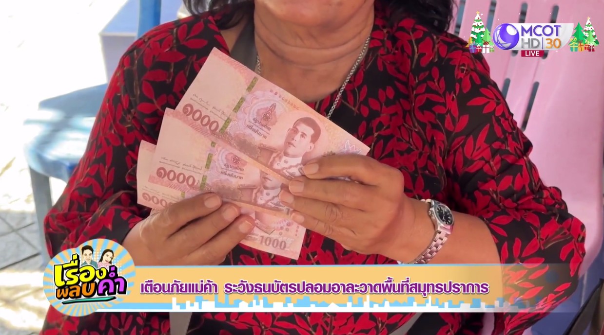 แม่ค้าลอตเตอรี่ ตรงข้ามศาลเจ้าพ่อหลักเมือง ต.ปากน้ำ อ.เมืองสมุทรปราการ นำธนบัตร 1,000 ปลอม มาเป็นหลักฐานแจ้งความที่ สภ.เมืองสมุทรปราการ หลังถูกมิจฉาชีพตีเนียนเป็นลูกค้าเข้ามาเลือกซื้อลอตเตอรี่ 24 ใบ ก่อนจะควักธนบัตร 1,000 ปลอม จำนวน 3 ใบ ออกมาจ่าย แล้วหนีลอยนวล