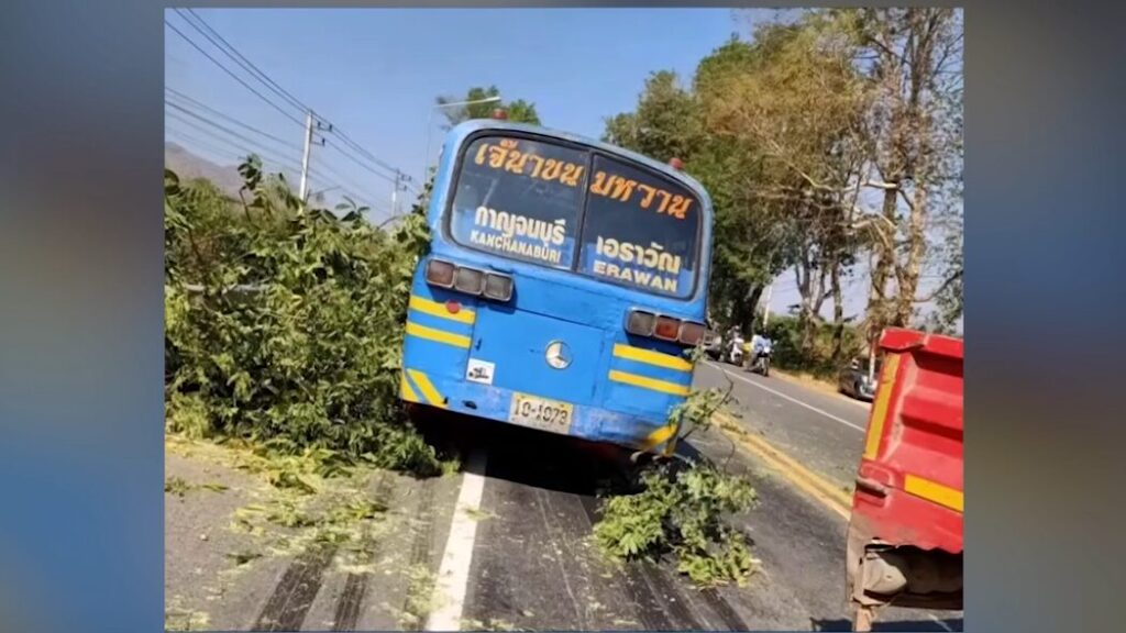 กาญจนบุรี 4 ม.ค. – เร่งตรวจสอบผู้ลักลอบโค่นต้นไม้ จนเกิดอุบัติเหตุต้นไม้ทับรถบัสโดยสารสายกาญจนบุรี-เอราวัณ นักท่องเที่ยวต่างชาติ บาดเจ็บ 9 ราย