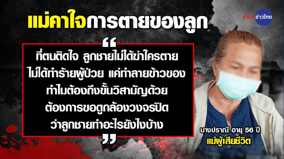 นางปราณี เล่าต่อว่า ตอนเกิดเหตุตนไปเข้าห้องน้ำกลับมา เห็นผู้ช่วยพยาบาล พูดว่าทำไมอยู่ไม่นิ่ง เพราะผู้ตายจะถอดสายน้ำเกลือ ตอนนั้นผู้ช่วยพยาบาลสองคนพูดไม่ค่อยดีเท่าไหร่ แล้วพยาบาลก็เอายากันชักมาฉีดเพิ่ม ไม่ถึง 10 นาที ลูกชายก็หลับ สักพักตื่นมาและถามตนอีกว่า เขาอยู่ที่ไหน แล้วก็ลุกพรวดและดึงสายน้ำเกลือทิ้ง ตนเลยเรียกขอความช่วยเหลือจากพยาบาล จากนั้นลูกชายก็ดิ้นหลุด และอาละวาด ซึ่งขณะนั้นคนไข้ก็นอนอยู่เต็มห้อง ถ้าเขาจะทำร้ายใคร ก็คงตายกันหมดแล้ว แต่ตนไม่เห็นว่าลูกชายทำร้ายใคร สักพักก็ได้ยินเสียงปืน 4 นัด เลยรู้ว่าเจ้าหน้าที่คงยิงแล้ว ที่ตนติดใจ คือลูกชายไม่ได้ฆ่าใครตาย ไม่ได้ทำร้ายผู้ป่วย แค่ทำลายข้าวของ ทำไมต้องถึงขั้นวิสามัญด้วย ระหว่างเกิดเหตุตนก็ไม่เห็น จึงต้องการขอดูกล้องวงจรปิด ว่าลูกชายทำอะไรยังไงบ้าง จะได้รู้ว่าลูกตนเองไล่ตีพยาบาลหรือตีใครมาบ้าง