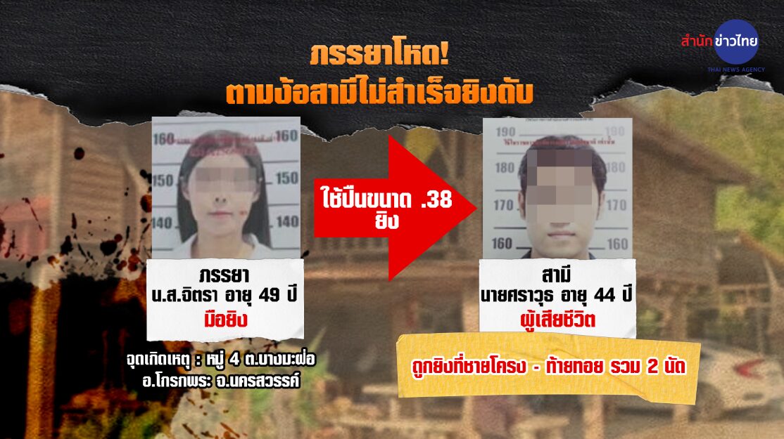 ตำรวจ สภ.โกรกพระ เข้าตรวจสอบภายในบ้านหลังหนึ่ง ในพื้นที่หมู่ 4 ต.บางมะฝ่อ อ.โกรกพระ จ.นครสวรรค์ หลังชาวบ้านแจ้งว่าเกิดเหตุยิงกัน ผู้ก่อเหตุคือ น.ส.จิตรา อายุ 49 ปี ชาว จ.ชลบุรี ใช้ปืนพก ขนาด.38 ยิงนายศราวุธ อายุ 44 ปี สามี เข้าที่ชายโครงและข้างท้ายทอยรวม 2 นัด เสียชีวิตบริเวณโต๊ะหินอ่อนชั้นล่างใต้ถุนบ้าน นางสาวจิตรามือยิงนั่งรอมอบตัวโดยไม่คิดหนี ตำรวจเก็บหลักฐานอาวุธปืน และคุมตัวมาสอบสวนที่ สภ.โกรกพระ