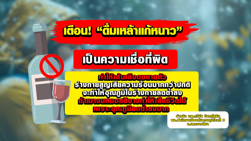 ด้านนายแพทย์ ทวีชัย วิษณุโยธิน ผู้อำนวยการสำนักงานป้องกันควบคุมโรคที่ 9 จ.นครราชสีมา ย้ำการดื่มเหล้าหวังแก้หนาวเป็นความเชื่อที่ผิด การดื่มเหล้าแก้หนาวมีโทษมากกว่า เพราะการดื่มเหล้าจะทำให้เส้นเลือดขยายตัว ทำให้ร่างกายสูญเสียความร้อนมากขึ้นกว่าปกติ จะทำให้อุณภูมิในร่างกายลดต่ำลง และถ้าคนเมาจนหมดสติอาจทำให้เสียชีวิตได้ เพราะอุณภูมิจะลดต่ำลงมาก ดังนั้น การดื่มเหล้าไม่ใช่เป็นการแก้หนาว