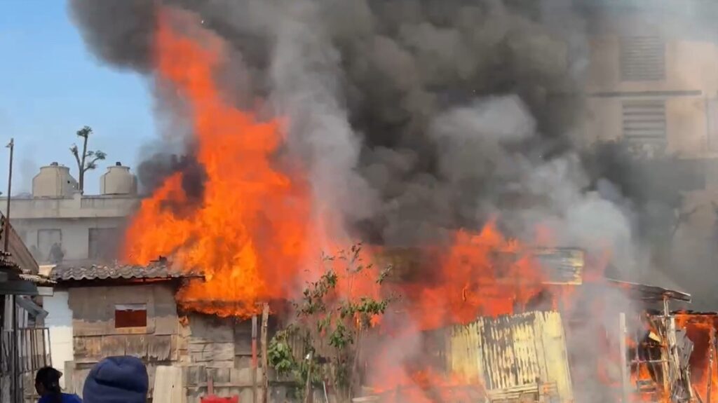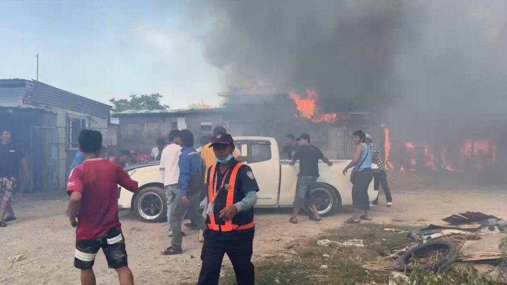 สภาพแสงเพลิงที่กำลังโหมลุกไหม้บ้านพักภายในชุมชนกลางซอยไพโอเนีย ต.บางโฉลง อ.บางพลี จ.สมุทรปราการ ช่วง 13.30 น. วานนี้ (13 ม.ค.) ส่วนใหญ่ปลูกเป็นบ้านไม้ชั้นเดียวติดกันหลายหลัง แสงเพลิงเกิดขึ้นที่บ้านหลังหนึ่งกลางชุมชน ก่อนลุกลามอย่างรวดเร็ว ทำให้ผู้พักอาศัยและกลุ่มแรงงานต่างด้าว ต่างหนีตาย ขนข้าวของหนีไฟอลหม่าน