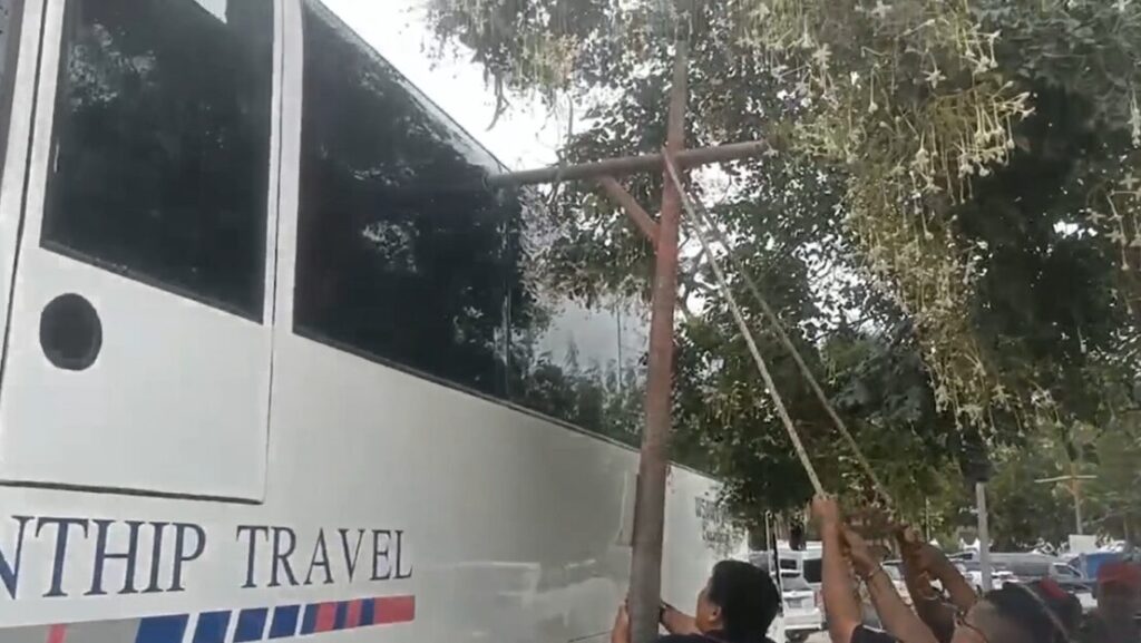พระนครศรีอยุธยา 20 ม.ค. – รถบัสพานักท่องเที่ยวชาวจีนมาเที่ยววังช้างอยุธยาแลเพนียด ถูกเหล็กทิ่มทะลุกระจก โชคดีไม่มีคนอยู่ข้างใน ด้านวังช้างอยุธยานำช้างพลายสองเชือกเข้าไปช่วยดึงเหล็กออก
