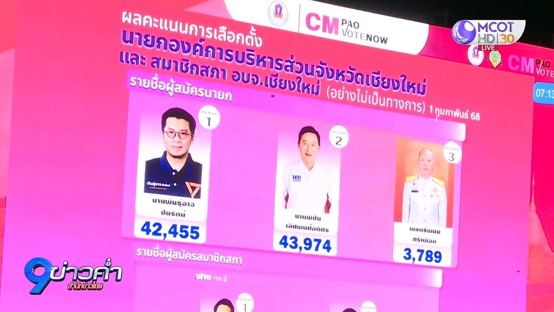คะแนนของผู้สมัครจากทั้งสองพรรค ขับเคี่ยวสูสีกันแบบหายใจรดต้นคอ ผลจากจอรายงานคะแนนเลือกตั้งนายกอบจ. แบบเรียลไทม์บริเวณหน้าอบจ.เชียงใหม่ พบว่า นายพิชัย เลิศพงศ์ อดิศร หรือ สว.ก๊อง อดีตนายก อบจ. จากพรรคเพื่อไทย ได้ 43,974 คะแนน ส่วนด็อกเตอร์พันธุ์อาจ ชัยรัตน์ ผู้สมัคร นายก อบจ. จากพรรคประชาชน ได้ 42,455 คะแนน แต่ยังต้องลุ้นกันยาวๆ เพราะเชียงใหม่ มีผู้มีสิทธิกว่า 1.3 ล้านคน