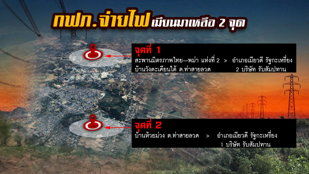 จุดที่ 2 ที่บ้านห้วยม่วง ต.ท่าสายลวด โยงสายไปถึงอำเภอเมียวดี รัฐกะเหรี่ยง มี 1 บริษัทได้รับสัมปทาน โดยการจ่ายไฟฟ้าในจุดซื้อขายไฟฟ้าไปยังเมียนมา คู่สัญญาทุกจุดซื้อขายไฟฟ้าเป็นผู้ได้รับสิทธิสัมปทานการซื้อขายไฟฟ้าจากรัฐบาลของเมียนมา โดยผ่านการรับรองความถูกต้องและความน่าเชื่อถือด้านเอกสารจากกระทรวงการต่างประเทศ และ กฟภ. ประสานกับหน่วยงานความมั่นคงของไทยในพื้นที่ ก่อนจำหน่ายไฟฟ้าไปยังเมียนมา