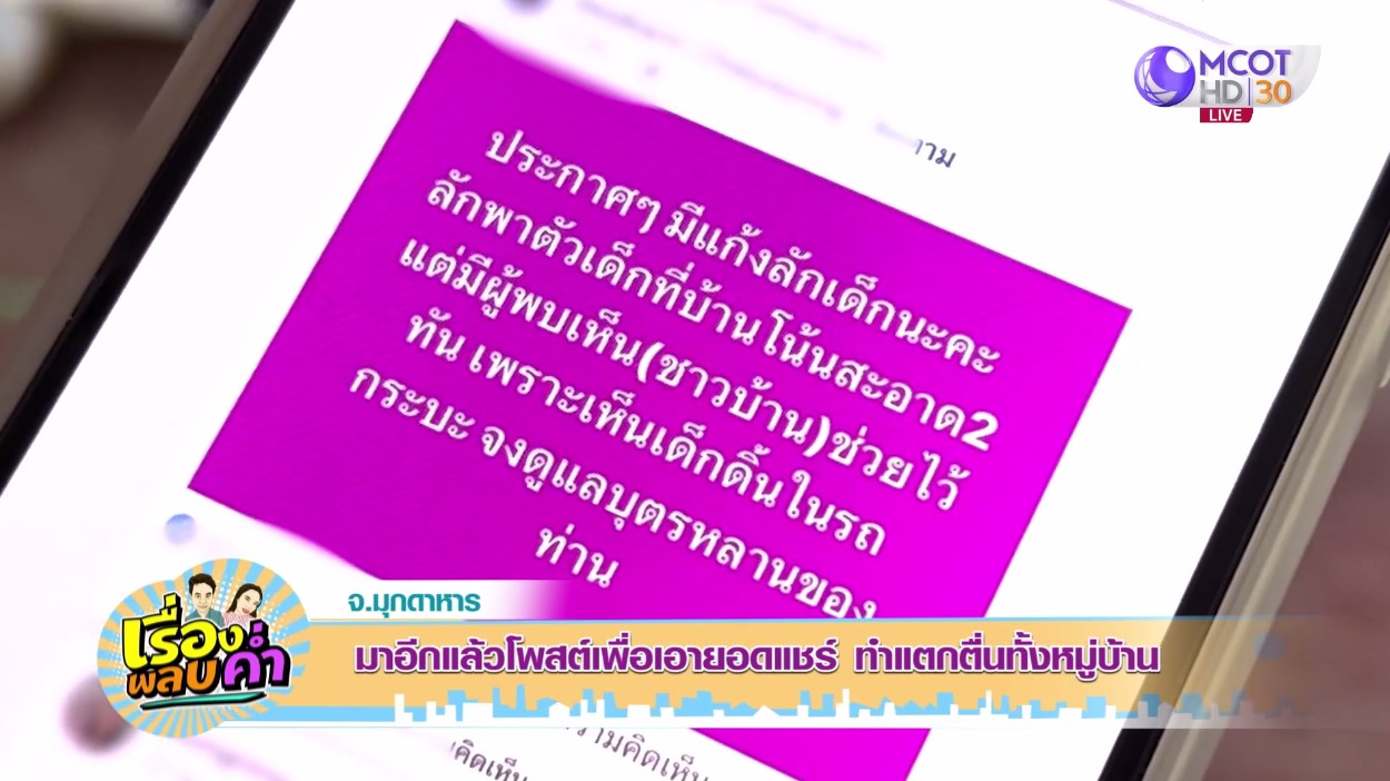 ตลอดวานนี้จนถึงช่วงเช้าวันนี้ (5 ก.พ.) ทำเอาชาวบ้านในพื้นที่บ้านโนนสะอาด และพื้นที่ใกล้เคียง อ.นิคมคำสร้อย จ.มุกดาหาร รวมถึงโรงเรียนในพื้นที่ วุ่นวายกันไปหมด หลังมีผู้ใช้เฟซบุ๊กรายหนึ่งโพสต์ข้อความว่า “ประกาศๆ มีแก๊งลักเด็ก ลักพาตัวเด็กบ้านโนนสะอาด 2 แต่มีคนพบเห็น (ชาวบ้าน) ช่วยไว้ทัน เพราะเด็กดิ้นในรถกระบะ จงดูแลบุตรหลานของท่าน” และมีผู้แชร์ออกไปในวงกว้างเกือบ 300 แชร์