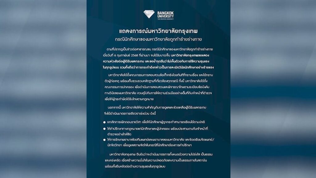 ขณะที่วันนี้ มหาวิทยาลัยวิทยาลัย ได้ออกแถลงการณ์ชี้แจง แสดงความห่วงใยผู้ได้รับผลกระทบ ย้ำจุดยืนไม่เห็นด้วยกับความรุนแรงทุกรูปแบบ ถือว่าเป็นความผิดวินัยนักศึกษาอย่างร้ายแรง พร้อมตั้งกรรมการสอบข้อเท็จจริง, ตั้งกรรมการสอบสวนและพิจารณาโทษตามระเบียบควบคู่กับการร่วมมือกับตำรวจให้ผู้กระทำผิดได้รับโทษตามกฎหมาย ขณะเดียวกันยังออกมาตรการเร่งด่วน ยกเลิกการเพิกถอนรายวิชาให้ผู้ถูกกระทำกลับมาเรียนตามปกติ ให้คำปรึกษาทางกฎหมาย และให้การรักษาพยาบาลโดยทีมแพทย์ของมหาวิทยาลัย
