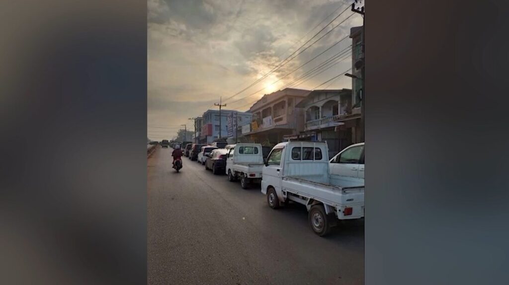 ส่วนที่จังหวัดเมียวดี ฝั่งตรงข้ามอำเภอแม่สอด พบว่าปั๊มน้ำมันขนาดใหญ่ยังเปิดให้บริการแต่จำกัดจำนวนการเติม ส่วนปั้มเล็กปิดให้บริการเนื่องจากขาดแคลนน้ำมัน โดยราคาน้ำมันวันนี้ (9 ก.พ.) ดีเซลลิตรละ 3,960 จ๊าด (ประมาณ 63.66 บาท) ส่วนเบนซิน 95 ลิตรละ 3,620 จ๊าด (ประมาณ 58.19 บาท) ชาวเมียวดียังต้องต่อแถวเพื่อเติมน้ำมันจนแน่นปั๊ม เช่นเดียวกับรถยนต์ที่ต้องต่อแถวยาวเป็นกิโลและต้องรอเติมน้ำมันนานนับชั่วโมง .-สำนักข่าวไทย