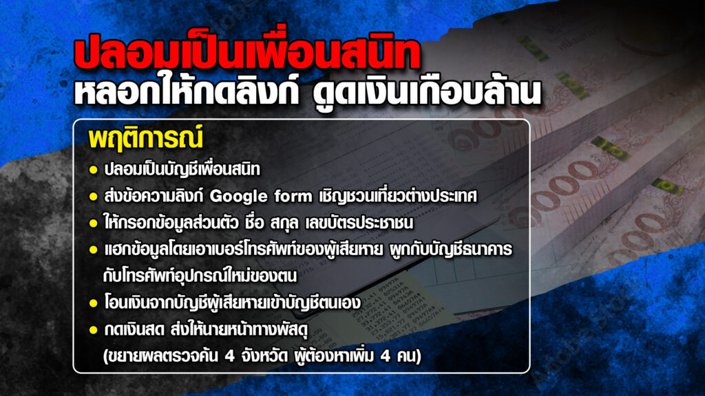 ตำรวจสอบสวนกลาง นำหมายจับศาลอาญา เข้าจับกุม น.ส.นุช และไม่มีสถานะทางทะเบียนราษฎร์ อายุ 34 ปี ที่ห้องแถวไม่มีชื่อ อ.สามพราน จ.นครปฐม หลังเมื่อปลายเดือนมกราคมที่ผ่านมา มีผู้เสียหายร้องขอความช่วยเหลือถูกแก๊งมิฉาชีพหลอกเงินเกือบ 1 ล้านบาท ขณะผู้เสียหายอยู่ต่างประเทศ คนร้ายปลอมเป็นเพื่อนสนิท ส่งข้อความลิงก์ Google form เชิญชวนเที่ยวต่างประเทศ และให้กรอกข้อมูลส่วนตัว ชื่อ-สกุล เลขบัตรประชาชน ผู้เสียหายหลงเชื่อ เมื่อมาถึงไทยกลับพบว่าเงินในบัญชีหายไปเกือบ 1 ล้านบาท จึงมาแจ้งความตำรวจให้ช่วยติดตามตัวคนร้ายมาดำเนินคดี