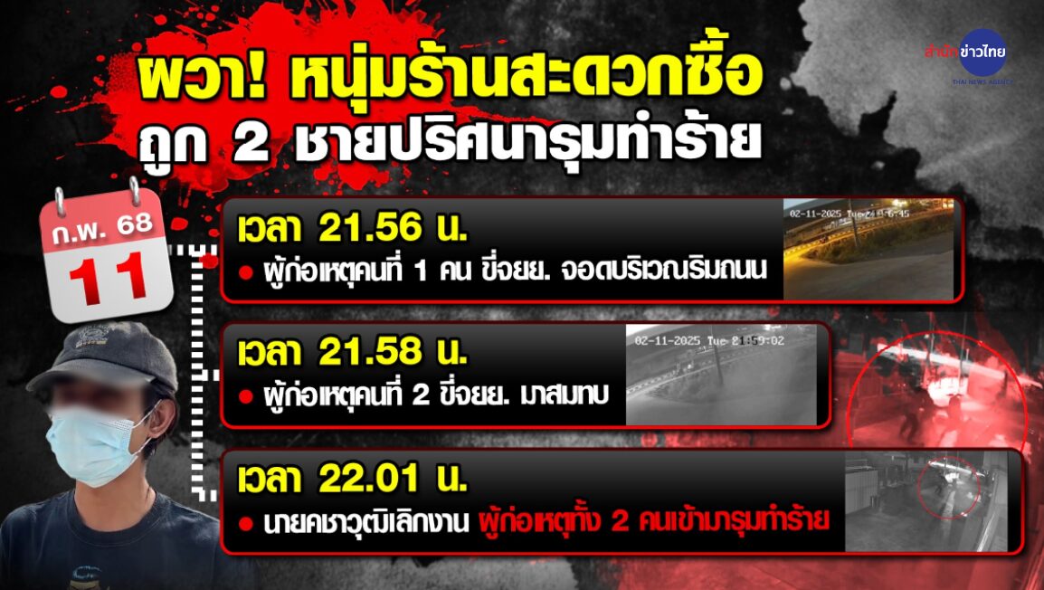 ภาพจากกล้องวงจรปิดบริเวณหน้าร้านสะดวกซื้อแห่งหนึ่งใน ต.ปากกราน อ.พระนครศรีอยุธยา จ.พระนครศรีอยุธยา เมื่อเวลา 21.56 น. วานนี้ (11 ก.พ.) เผยให้เห็นชายคนร้าย 2 คน ขี่ซ้อนท้ายรถจักรยานยนต์ และจอดไว้ริมทาง ก่อนจะลงมาวิ่งไล่ทำร้าย นายคชาวุฒิ อายุ 21 ปี พนักงานร้านสะดวกซื้อ ที่เพิ่งออกเวรกำลังจะกลับบ้าน โดยคนร้ายทั้งสองช่วยกันรุมเตะและต่อยผู้เสียหายนับครั้งไม่ถ้วน ใช้เวลาราว 5 นาที ก่อนจะพากันหลบหนีไป