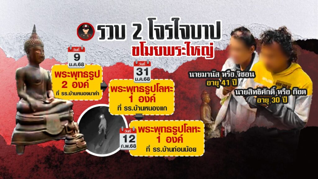 ตำรวจจับกุมตัวนายมานัส หรือ จิซอน อายุ 41 ปี และนายสิทธิศักดิ์ หรือ ก๊อต อายุ 30 ปี ผู้ต้องหาขโมยพระพุทธรูปในหลายโรงเรียนของพื้นที่ตำบลหนองนาคำ อำเภอเมืองอุดรธานี ก่อนจะพามากราบขอขมาพระพุทธรูปที่ลักขโมยไป ทั้งคู่ทำหน้าซื่อๆ บอกกับตำรวจ ไม่ได้ตั้งใจขโมย กลัวบาป แต่มันจำเป็น และขโมยพระพุทธรูปขนาดใหญ่แบบนี้มาแล้ว 3 โรงเรียน