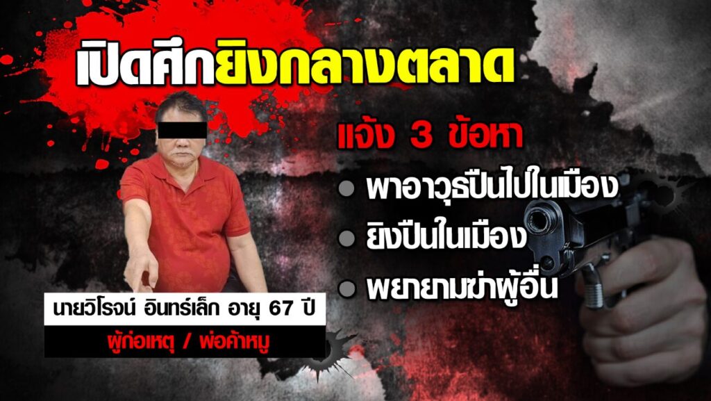 กทม. 6 มี.ค. – ตำรวจแจ้ง 3 ข้อหาหนัก พ่อค้าหมู หลังก่อเหตุยิงพ่อค้าอาหารทะเลบาดเจ็บสาหัสกลางตลาด ปมเหตุเมียทะเลาะกัน