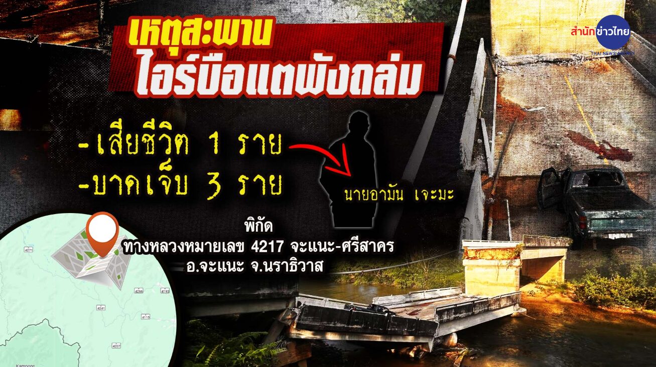 วันนี้ เวลา 05.45 น. เกิดเหตุสะพานซึ่งตั้งอยู่ที่ถนนทางหลวง หมายเลข 4217 จะแนะ- ศรีสาคร บริเวณบ้านไอร์บือแต จังหวัดนราธิวาส พังถล่มลงมา ทำให้รถกระบะและรถจักรยานยนต์ที่ใช้เส้นทางตกลงไป เบื้องต้นมีผู้เสียชีวิต 1 คน คือ นายอามัน เจะมะ ชาวบ้านหมู่บ้านกลูบี อำเภอศรีสาคร และได้รับบาดเจ็บ 3 คน ส่วนรายละเอียดเพิ่มเติมและความคืบหน้าของเหตุการณ์จะรายงานให้ทราบต่อไป.-สำนักข่าวไทย