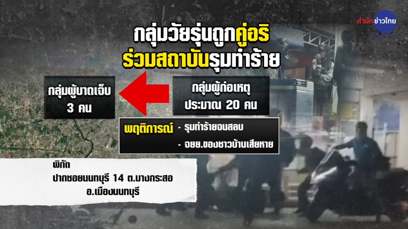 หลังเกิดเหตุ น.ส.เตย อายุ 24 ปี นักศึกษา ปี 4 ซึ่งเป็น 1 ใน 2 คน ที่โดนรุมทำร้ายบาดเจ็บ เข้าแจ้งความที่ สภ.รัตนาธิเบศร์ ในสภาพมีบาดแผลหลายจุด เล่าว่า เพื่อนโทรมาบอกว่าให้ช่วยเดินไปดูรุ่นน้องที่ร้านสะดวกซื้อ ถูกคู่อริดักรอ ออกจากร้านไม่ได้ ตนคิดว่าตัวเองเป็นผู้หญิงคงไม่มีอะไร ตนและเพื่อนอีก 1 คน จึงเดินไปดู เห็นรุ่นน้องเดินวนอยู่ในร้าน มีกลุ่มวัยรุ่นคู่อริของรุ่นน้องยืนดักอยู่หน้าร้าน เท่าที่รู้จักมีรุ่นพี่ชื่อหน่อง 59 และเพื่อนอีกคนยืนขวางประตูร้าน เมื่อซื้อของเสร็จจึงพารุ่นน้องออกจากร้าน โดยมีกลุ่มผู้ก่อเหตุเดินตาม