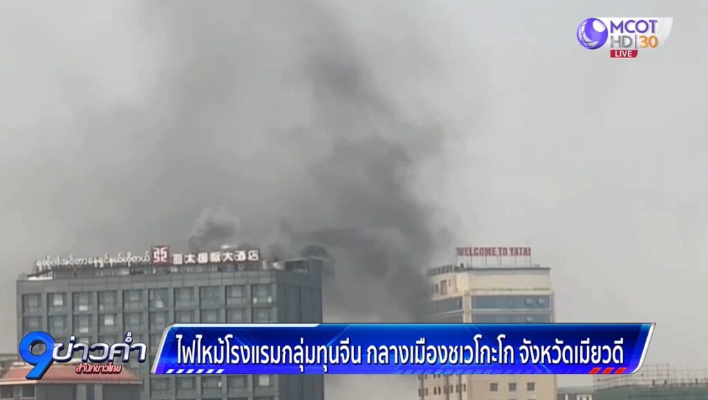 ตาก 20 มี.ค. – เพลิงไหม้โรงแรมกลุ่มบริษัททุนจีน กลางเมืองชเวโกะโก จังหวัดเมียวดี ติดแนวชายแดนไทย-เมียนมา เบื้องต้นยังไม่มีรายงานผู้ได้รับบาดเจ็บ