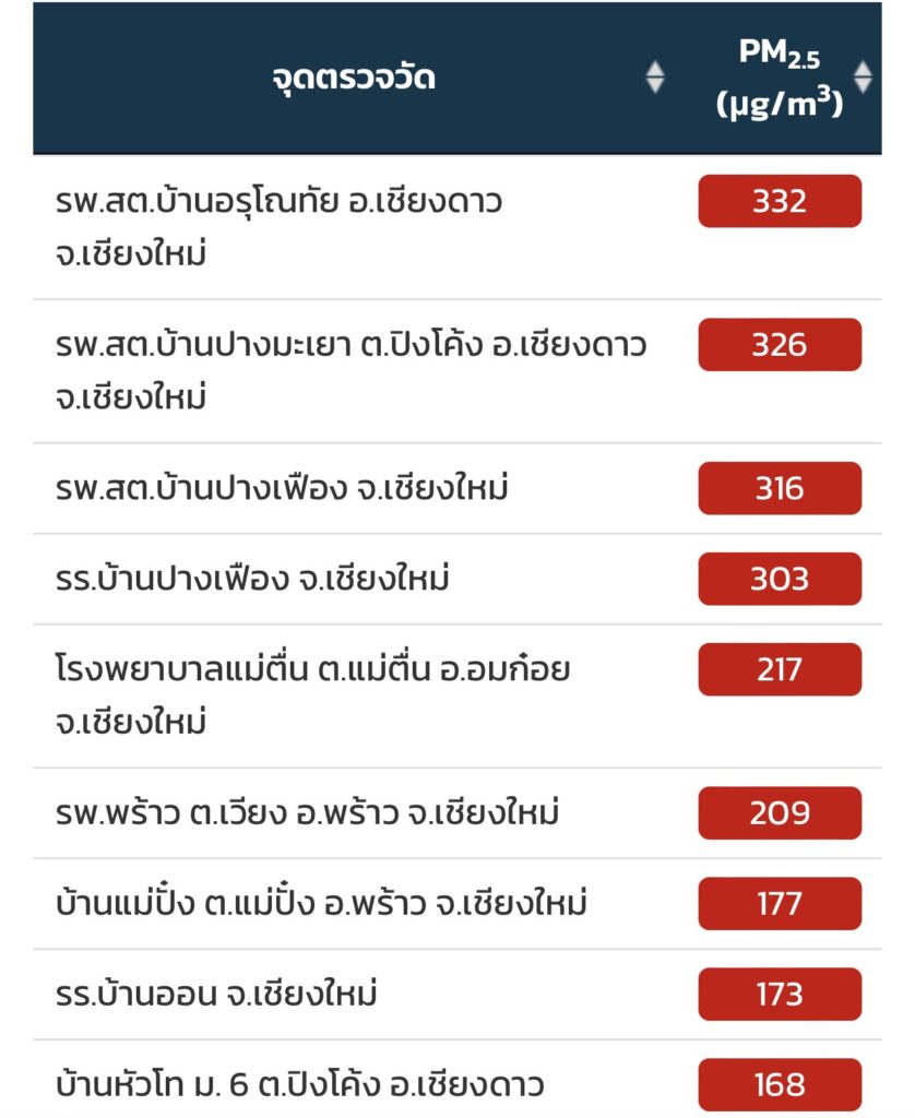 ทั้งนี้ ศูนย์ข้อมูลการเปลี่ยนแปลงสภาพภูมิอากาศ มหาวิทยาลัยเชียงใหม่ หรือ cmuccdc รายงานค่าฝุ่นพิษรายชั่วโมงจาก ช่วงเวลา 10.00 น. สูงสุดอยู่ที่ 378 ไมโครกรัมต่อลูกบาศก์เมตร ที่โรงพยาบาลส่งเสริมสุขภาพตำบลบ้านอรุโณทัย อำเภอเชียงดาว ส่วนในอำเภอเมือง ค่าฝุ่นสูงสุดรายชั่วโมง อยู่ที่ 103 ไมโครกรัมต่อลูกบาศก์เมตร ซึ่งส่งผลกระทบต่อสุขภาพแล้วเช่นเดียวกัน โดยเว็บไซต์ของไอคิวแอร์ เว็บไซต์รายงานคุณภาพอากาศโลก ได้จัดอันดับเมืองหลัก ที่มีมลพิษมากที่สุดของโลก ในเช้าวันนี้ช่วง 10.00 น. เชียงใหม่ยังอยู่อันดับ 7 คุณภาพอากาศ อยู่ที่ 167 ยูเอสเอคิวไอ สาเหตุส่วนใหญ่ยังมาจากการเผา โดยพบจุดความร้อนมากถึง 502 จุด โดยพบมากสุดที่แม่ฮ่องสอน 72 จุด ส่วนใหญ่อยู่ในพื้นป่าอนุรักษ์ 304 จุด รองลงมาคือป่าสงวนและพื้นที่เกษตร.-719-สำนักข่าวไทย