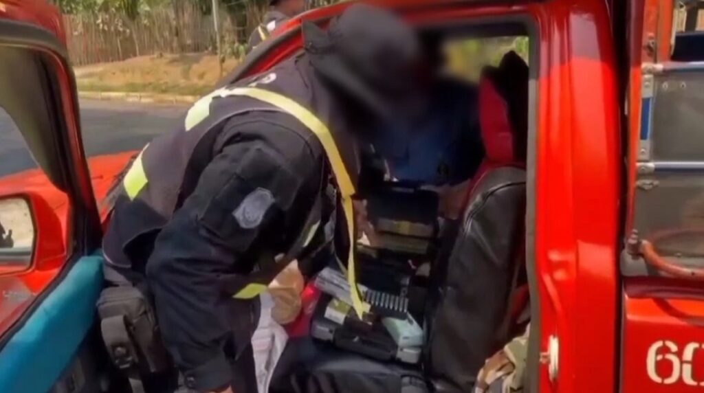 บริเวณหลังเบาะผู้โดยสารด้านหน้ารถ พบกระสอบสีขาวซุกซ่อนอยู่ เปิดออกดูพบอาวุธปืน กระสุนปืน และวัตถุระเบิดทางทหาร จำนวน 5 รายการ ประกอบด้วย ปืนพกสั้น ขนาด 9 มม. ยี่ห้อซิกซาวเออร์ จำนวน 2 กระบอก, ซองกระสุน ขนาด 9 มม. จำนวน 4 ซอง, เครื่องกระสุนปืน ขนาด 9 มม. จำนวน 200 นัด, ลูกระเบิดขว้างแบบ M67 จำนวน 1 ลูก และลูกระเบิดขว้างแบบ K75 จำนวน 1 ลูก