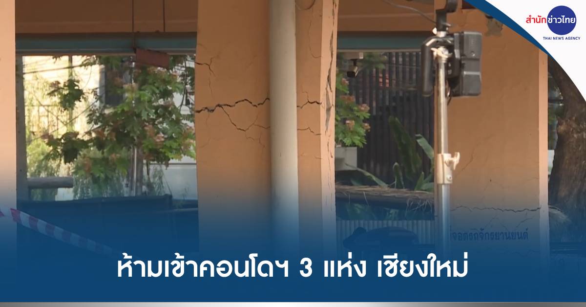 เชียงใหม่ 29 มี.ค.-เจ้าหน้าที่เร่งตรวจสอบอาคารและตึกสูงใน จ.เชียงใหม่ เบื้องต้นสั่งห้ามเข้าพักอาศัยในคอนโด 3 แห่ง รวมทั้ง “ดวงตะวันคอนโด” อาคารและเสามีรอยร้าวจำนวนมาก เสี่ยงถล่ม