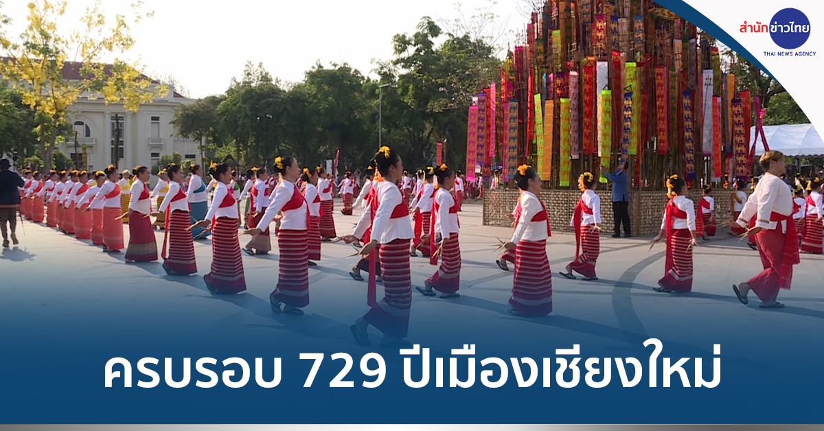 ช่วงเช้าที่ผ่านมา ชาวเชียงใหม่และนักท่องเที่ยว ร่วมกันแต่งกายชุดพื้นเมืองอย่างสวยสดงดงาม ร่วมทำบุญตักบาตรเพื่อความเป็นสิริมงคล เนื่องในวันที่เมืองเชียงใหม่ มีอายุครบ 729 ปี ก่อนที่ช่างฟ้อนรุ่นเล็กรุ่นใหญ่รวม 729 คน ในชุดผ้าซิ่นห่มสไบ ทัดดอกเอื้องสีเหลืองสดสวยงาม เคลื่อนขบวนอัญเชิญ เครื่องสักการะตามแบบวัฒนธรรมล้านนา มาตามถนนจนถึงหน้าพระบรมราชานุสาวรีย์สามกษัตริย์ เพื่อทำพิธี ยอสวยไหว้สา รำลึกพระมหากรุณาธิคุณ พญามังราย เจ้าผู้ครองนครเชียงใหม่ พร้อมด้วยพ่อขุนรามคำแหงแห่งเมืองสุโขทัย พ่อขุนงำเมือง แห่งเมืองพะเยา พระปิยะสหายที่ร่วมกันสร้างบ้านแปงเมืองนพบุรีศรีนครพิงค์เชียงใหม่ ตั้งแต่ พ.ศ.1839 หรือเมื่อ 729 ปีก่อน จนเป็นเมืองเชียงใหม่ที่รุ่งเรืองมาถึงทุกวันนี้ โดยมีตัวแทนหน่วยงานภาครัฐ ร่วมถวายเครื่องสักการะตามแบบประเพณีล้านนา ก่อนช่างฟ้อนทั้งหมดจะร่วมกันฟ้อนเล็บถวายแด่องค์บูรพระกษัตริย์ ทั้ง 3 พระองค์ สร้างความตื่นตาตื่นใจให้กับนักท่องเที่ยวที่เฝ้าชมเป็นอย่างมาก