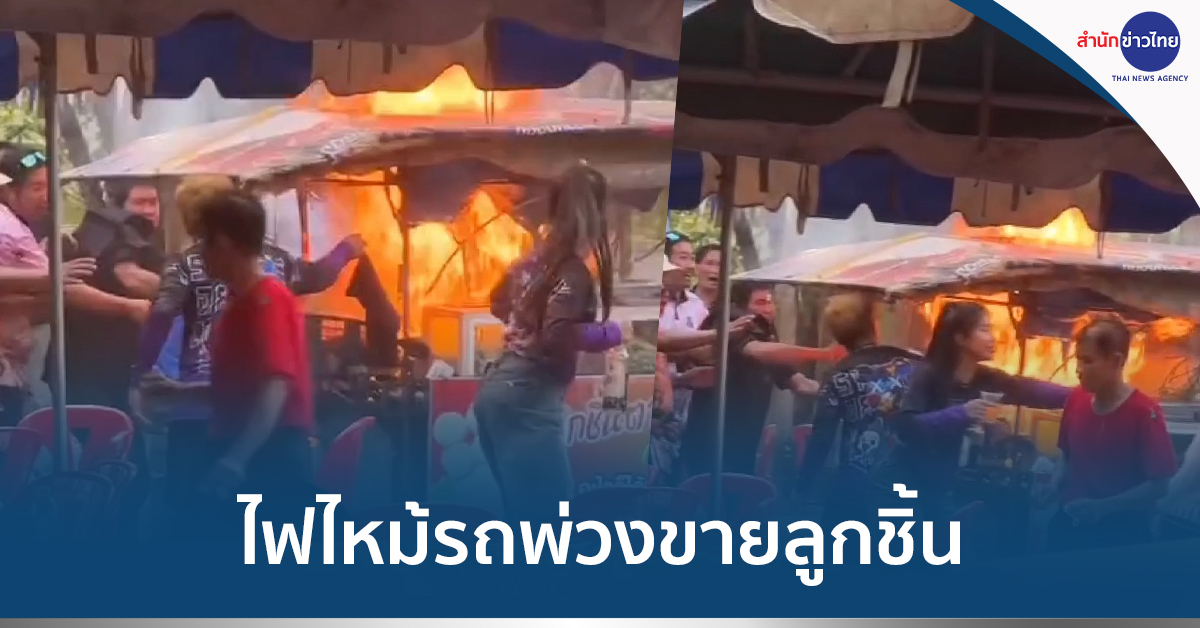 มุกดาหาร 13 เม.ย.- ระทึกกลางงานบุญ ไฟไหม้รถพ่วงขายลูกชิ้น ชาวบ้านช่วยกันดับไฟอลหม่าน เกือบวอดทั้งคัน