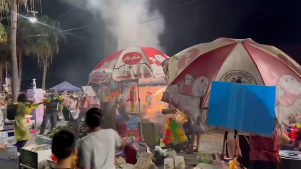 ไฟลุกไหม้ร้านไก่ทอด นักท่องเที่ยวที่เล่นสงกรานต์กันอยู่ไม่รอช้า รีบเข้าไปช่วยกันใช้ปืนฉีดน้ำใส่กองเพลิง จนสุดท้ายก็ดับ เหตุการณ์นี้เกิดขึ้นช่วงคืนที่ผ่านมา 19 เมษายน บริเวณถนนเลียบชายหาดพัทยา สอบถามพ่อค้าขายแตงโมใกล้จุดเกิดเหตุเล่าว่า ขณะนั่งขายของอยู่ เห็นแสงไฟพุ่งขึ้นจากเตาทอดของร้านไก่ทอดอย่างรวดเร็ว จึงรีบกระโดดเข้าไปปิดวาล์วแก๊ส และยกถังแก๊สออกห่างจากต้นเพลิงทันที