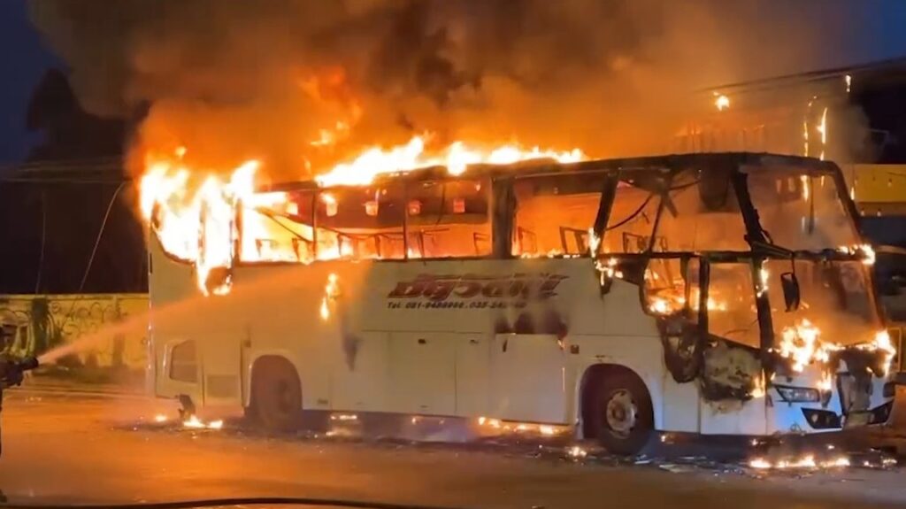 พระนครศรีอยุธยา 21 เม.ย. – คนขับรถบัสสตาร์ทเครื่องเตรียมรับพนักงาน แวะไปเข้าห้องน้ำแค่ 5 นาที กลับมาไฟไหม้รถเสียหายทั้งคัน โชคดีไม่มีพนักงานอยู่บนรถ