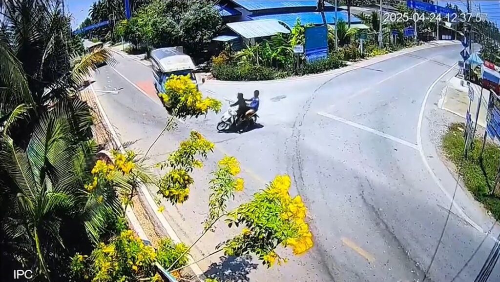 กล้องวงจรปิดจับภาพนาทีชายขี่รถจักรยานยนต์ออกมาจากแยกไม่ทันระวังพุ่งตัดหน้ารถสองแถวโดยสาร ชนเข้าอย่างแรง ก่อนเสียหลักชนเสาไฟฟ้าแรงสูงหักโค่น จนกล้องวงจรปิดดับทันที