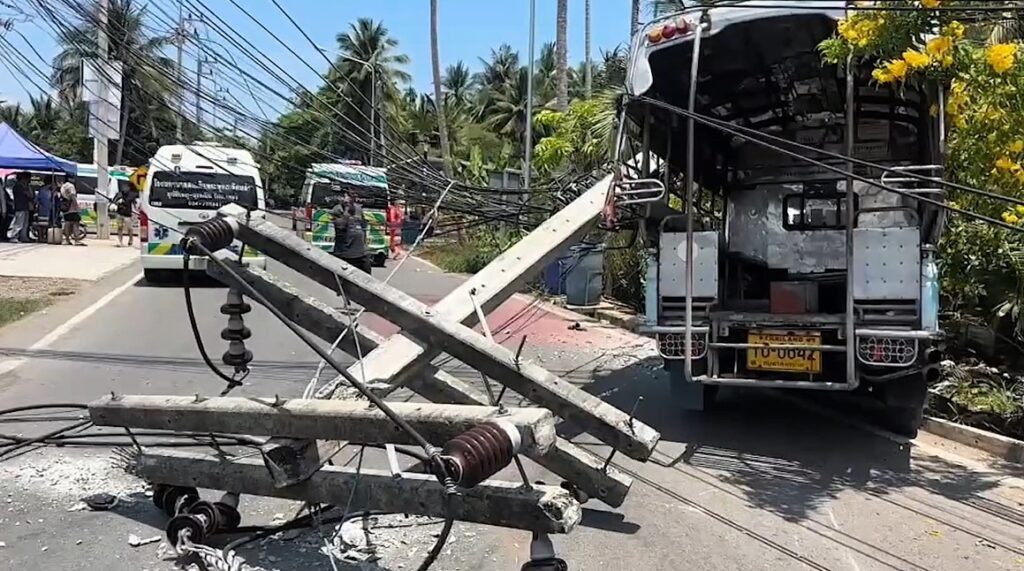 เหตุเกิดบริเวณสามแยกปากทางเข้าวัดศรีศรัทธาธรรม อ.เมือง จ.สมุทรสงคราม บาดเจ็บ 3 ราย และเสาไฟฟ้าหัก 1 ต้น ทำให้ไฟฟ้าดับเป็นบริเวณกว้าง ตำรวจและเจ้าหน้าที่กู้ภัยเข้าตรวจสอบพบผู้บาดเจ็บกระเด็นตกลงไปในร่องสวน ขณะที่เสาไฟฟ้าหักโค่น สายไฟฟ้าพาดขวางทางเข้า เจ้าหน้าที่กู้ภัยจึงต้องประสานเจ้าหน้าที่การไฟฟ้าส่วนภูมิภาค จ.สมุทรสงคราม เร่งตัดกระแสไฟ เพื่อเข้าไปช่วยเหลือคนเจ็บออกจากที่เกิดเหตุ ก่อนจะนำร่างผู้บาดเจ็บทั้ง 3 ราย คือ นายดำริห์ อายุ 67 ปี คนขับรถสองแถว ได้รับบาดเจ็บหน้าผากกระแทกคอนโซล มีแผลแตกเลือดไหลออกจำนวนมาก, นายธนกิตติ์ อายุ 18 ปี คนขี่รถจักรยานยนต์ อาการสาหัส และ ด.ช.ธีรณัฏฐ์ อายุ 12 ปี ได้รับบาดเจ็บศีรษะ หน้าผากปูดบวม เร่งนำส่งโรงพยาบาลสมเด็จพระพุทธเลิศหล้า ทั้ง 3 ราย