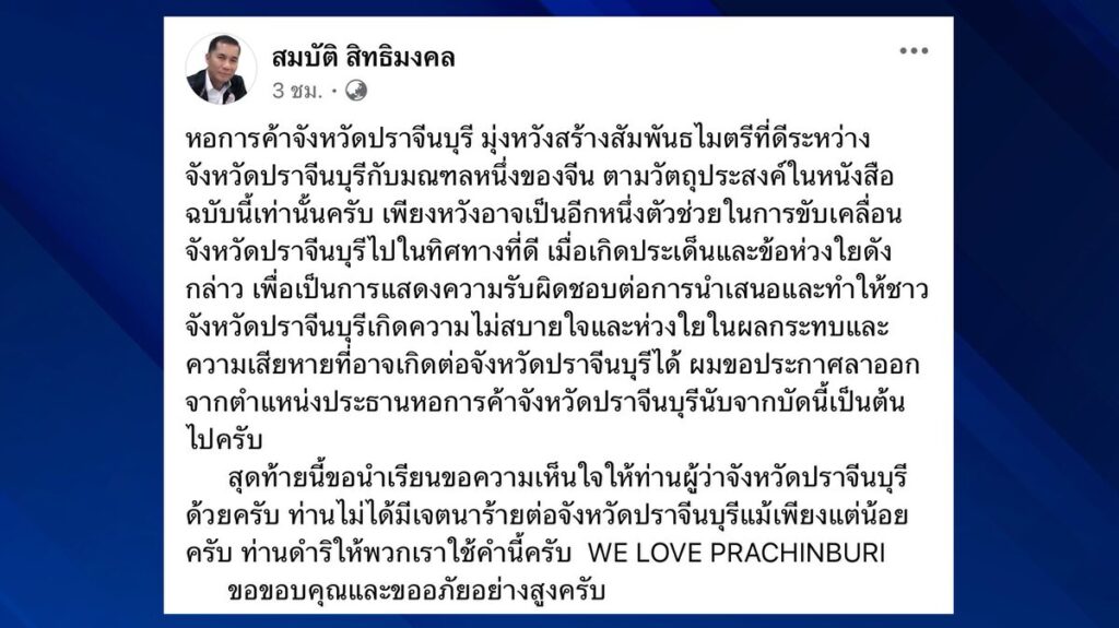 ล่าสุด นายสมบัติ สิทธิมงคล ประธานหอการค้าจังหวัดปราจีนบุรี โพสต์เอกสารในเฟซบุ๊ก ประกาศลาออกจากตำแหน่งประธานหอการค้าจังหวัดปราจีนบุรี เพื่อแสดงความรับผิดชอบต่อกรณีดังกล่าว โดยระบุว่า “หอการค้าจังหวัดปราจีนบุรี มุ่งหวังสร้างสัมพันธไมตรีที่ดีระหว่างจังหวัดปราจีนบุรีกับมณฑลหนึ่งของจีน ตามวัตถุประสงค์ในหนังสือฉบับนี้เท่านั้นครับ เพียงหวังอาจเป็นอีกหนึ่งตัวช่วยในการขับเคลื่อนจังหวัดปราจีนบุรีไปในทิศทางที่ดี เมื่อเกิดประเด็นและข้อห่วงใยดังกล่าว เพื่อเป็นการแสดงความรับผิดชอบต่อการนำเสนอและทำให้ชาวจังหวัดปราจีนบุรีเกิดความไม่สบายใจและห่วงใยในผลกระทบและความเสียหายที่อาจเกิดต่อจังหวัดปราจีนบุรีได้ ผมขอประกาศลาออกจากตำแหน่งประธานหอการค้าจังหวัดปราจีนบุรีนับจากบัดนี้ เป็นต้นไปครับ”.-สำนักข่าวไทย