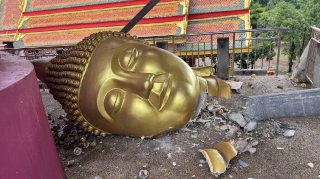 ปราจีนบุรี 2 พ.ค. – พายุหมุนถล่มวัดหนองคุ้ม จ.ปราจีนบุรี หลังคาวิหารหล่นทับหลวงพ่อพุทธโสธรจำลององค์ใหญ่ เศียรหัก ตกลงมากองที่พื้น