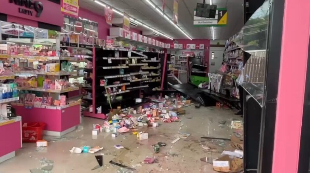 สภาพภายในซูเปอร์มาเก็ตที่ตลาดโพธิ์พระยา อ.เมือง จ.สุพรรณบุรี กระจกแตก ข้าวของเสียหาย และมีรถเข้าไปจอดอยู่ภายในร้าน ตำรวจ สภ.เมืองสุพรรณบุรี พร้อมกู้ภัย เข้าไปตรวจสอบ ในที่เกิดเหตุพนักงานของร้าน ราว 10 คน อยู่ในอาการตกใจ