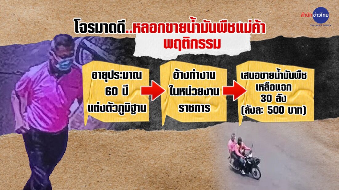 ภาพจากกล้องวงจรปิดภายในตลาดสดดอนทอง ต.หน้าเมือง อ.เมืองฉะเชิงเทรา เผยให้เห็นชายอายุประมาณ 60 ปี แต่งตัวดีภูมิฐานลงมาจากรถสามล้อ ก่อนเดินหน้าเป้าหมาย เดินเข้าไปในร้านขายข้าวต้ม หายไปสักพัก ก่อนจะเดินออกมายืนรอข้างถนนขึ้นรถไปกับเจ้าของร้าน เพื่อไปศาลากลางจังหวัดฉะเชิงเทรา ก่อนจะมีภาพสุดท้ายคือนั่งรถวินจักรยานยนต์หลบหนีไป ซึ่งพฤติกรรมนี้เป็นการหลอกขายน้ำมันพืช ทำให้เจ้าของร้านผู้หายสูญเงินไป 15,000 บาท