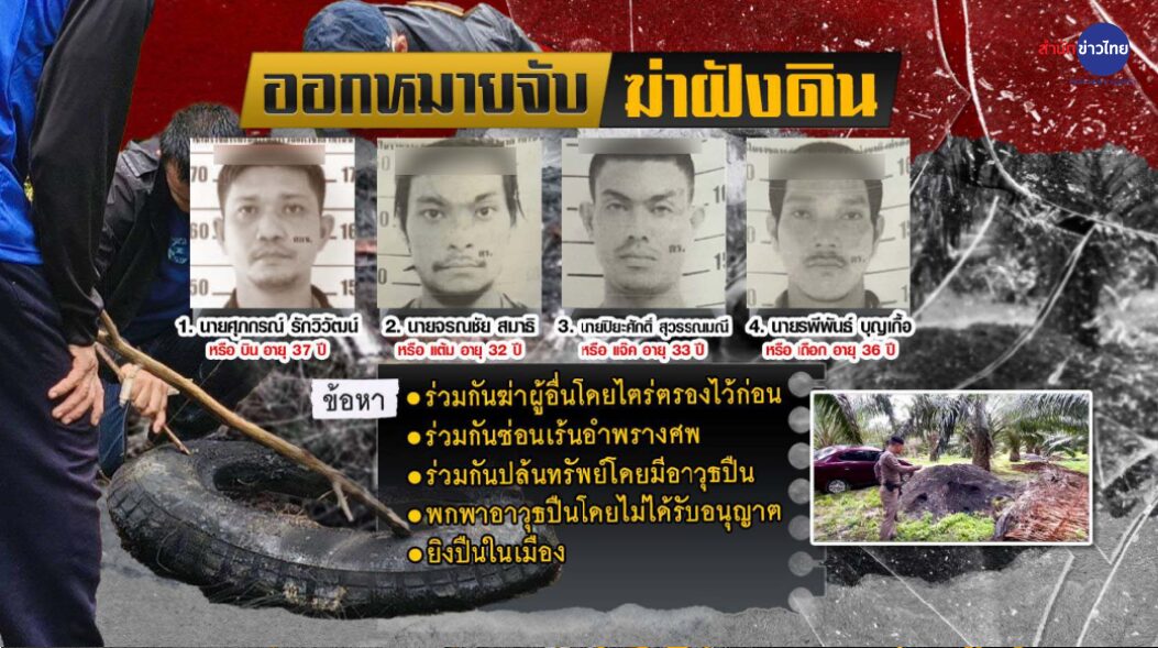 ทั้งนี้ ศาลจังหวัดตรังอนุมัติหมายจับผู้ก่อเหตุ 4 คน ในข้อหา ร่วมกันฆ่าผู้อื่น โดยไตร่ตรองไว้ก่อน, ร่วมการซ่อนเร้นย้ายทำลายศพ ปิดบังการตาย, ร่วมกันปล้นทรัพย์เป็นเหตุให้ผู้อื่นถึงแก่ความตาย, ร่วมกันมีอาวุธปืน กระสุนปืนไว้ในครอบครอง, พกพากระสุนปืนไปในทางสาธารณะ และยิงปืนในที่สาธารณะโดยไม่มีเหตุอันควร ส่วนจะมีข้อหาอื่นเพิ่มเติมหรือไม่ ต้องรอสอบสวนข้อเท็จจริงทั้งหมดก่อน เบื้องต้นแนวทางการสอบสวนในประเด็นฆ่าเผานั่งยาง น่าจะมุ่งไปในประเด็นขัดแย้งผลประโยชน์ในเรื่องของการจัดเก็บปาล์มน้ำมัน ส่วนศพชายวัยรุ่นที่ถูกขุดพบในพื้นที่เดียวกัน คาดว่าเป็นฝีมือของกลุ่มผู้ต้องหา อาจจะฆ่านอกพื้นที่ และนำมาอำพรางไว้ในสวนปาล์มน้ำมันแห่งนี้.-สำนักข่าวไทย