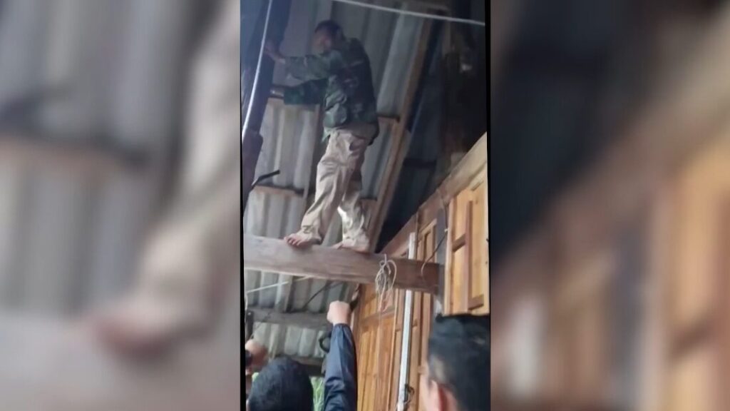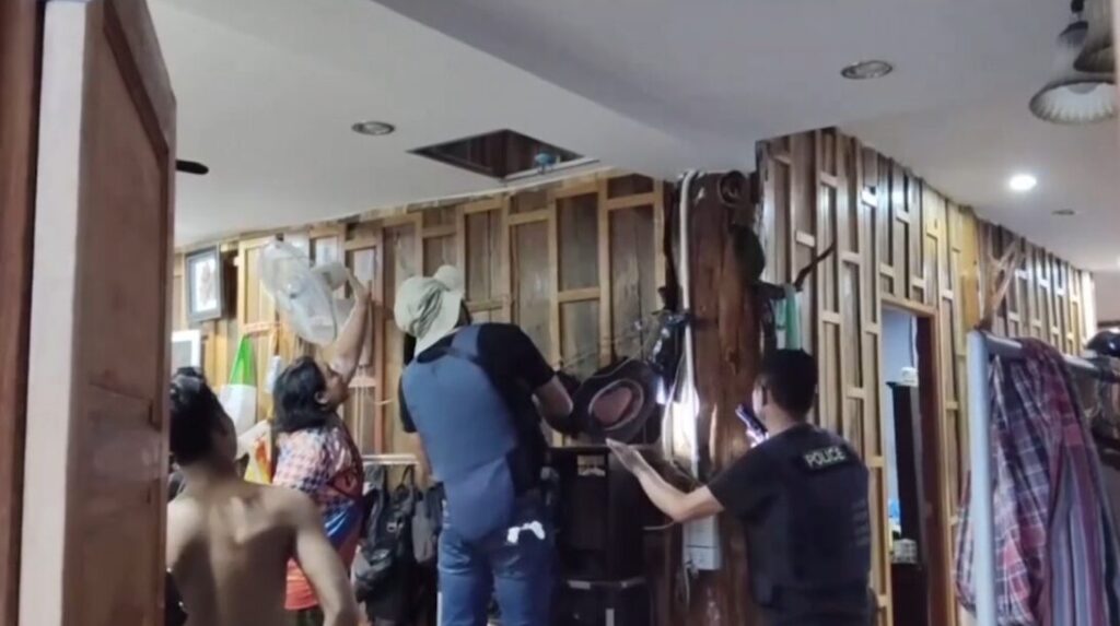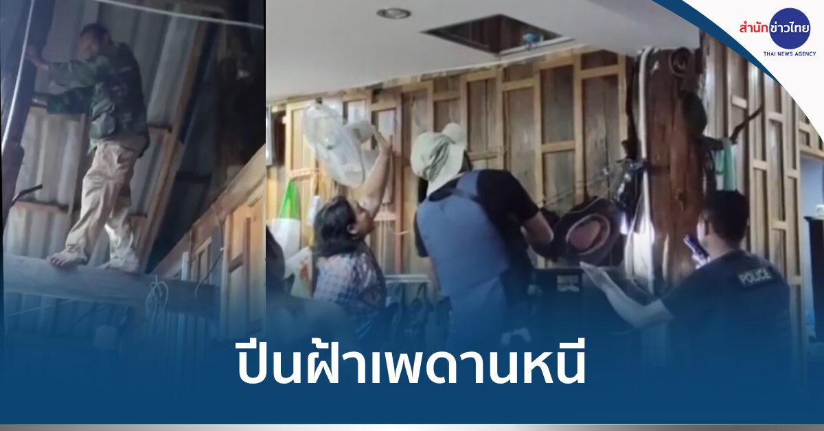 สงขลา 15 พ.ค. – เจ้าหน้าที่ ตชด. ปิดล้อมจับกุมผู้ต้องหาคดียาเสพติด จนมุมปีนฝ้าเพดานซ่อนตัว สุดท้ายทนไม่ไหว ยอมลงมาให้จับโดยดี